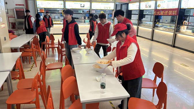 在站岗的同时,志愿者们还主动帮助清理餐桌上的残羹剩饭,保持桌面清洁,方便后续同学使用,竟显传承雷锋精神。