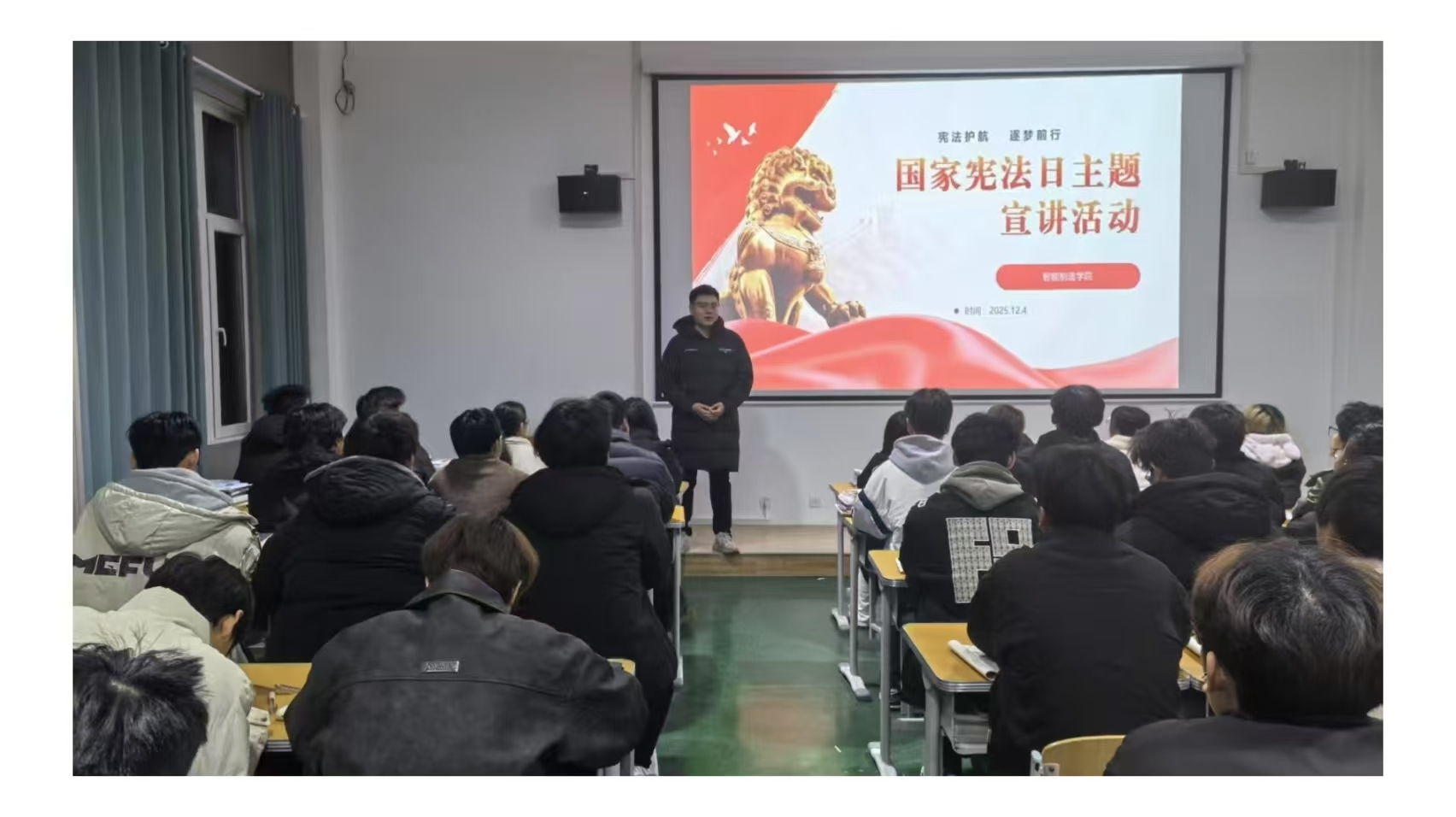 为深入践行习近平法治思想,在第十二个国家宪法日来临之际,智能制造学院围绕“学习宣传贯彻习近平法治思想,推动宪法深入人心”这一核心主题,于12月4日精心策划并举办了“宪法护航,逐梦前行”主题宣讲活动,旨在以法治之光照亮青年成长之路,为高技能人才培养筑牢法治基石。