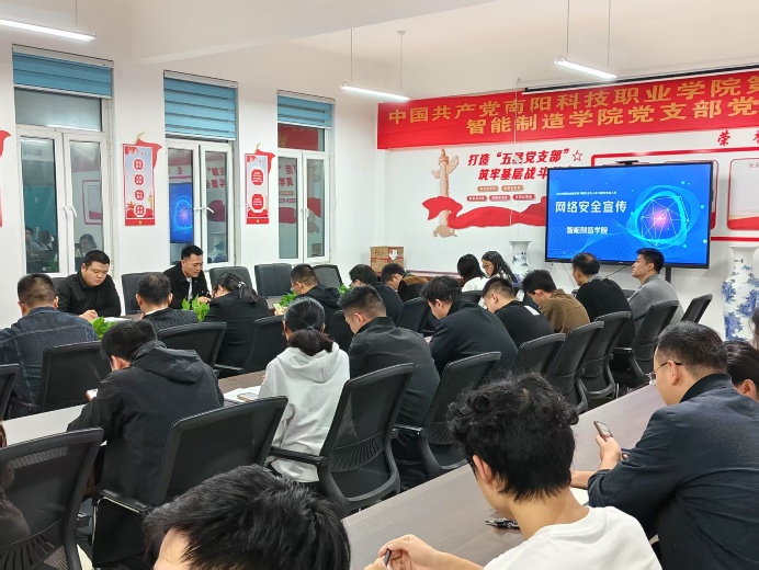 为切实增强全院学生网络安全防范意识,提升辅导员网络育人与风险处置能力,智能制造学院于2025年10月8日晚在党员会议室组织召开以“筑牢网络安全防线 护航青春成长之路”为主题的网络安全教育讲座,院内各班主任、辅导员齐聚一堂,副院长杨帆出席会议,会议由学生科科长李行主持。