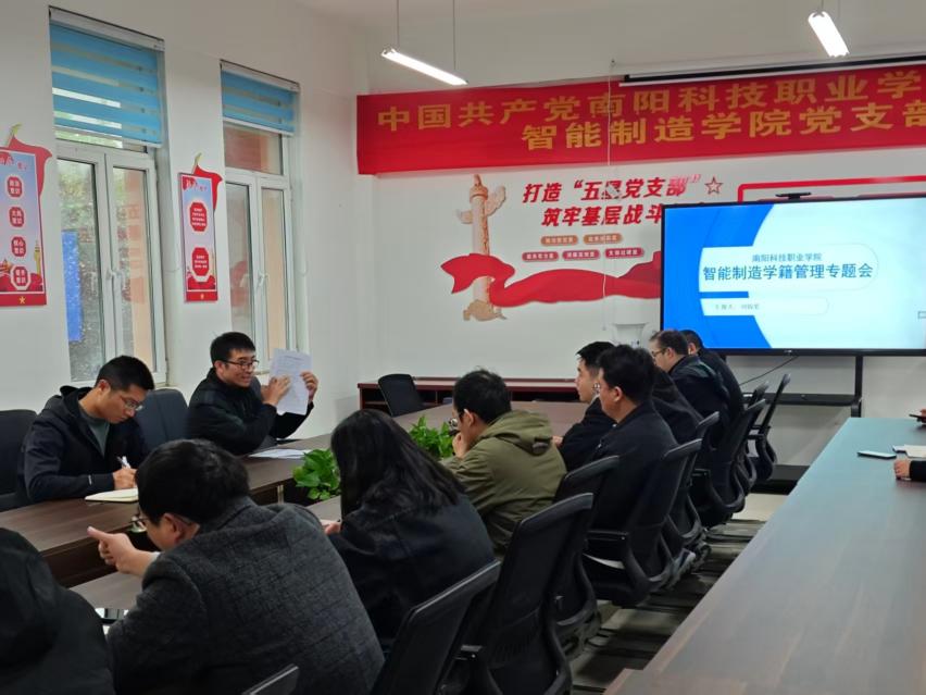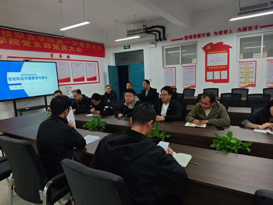 为进一步规范学籍管理工作,保障教学秩序,助力学生健康成长,2025年10月22日,智能制造学院召开学籍管理专题会议。学院党支部副书记赵钦、全体辅导员参加会议,围绕在校生核查、学生联系、处分处理、退学管理等多项学籍管理关键工作展开深入研讨,会议由学生科刘炳栾老师主持。