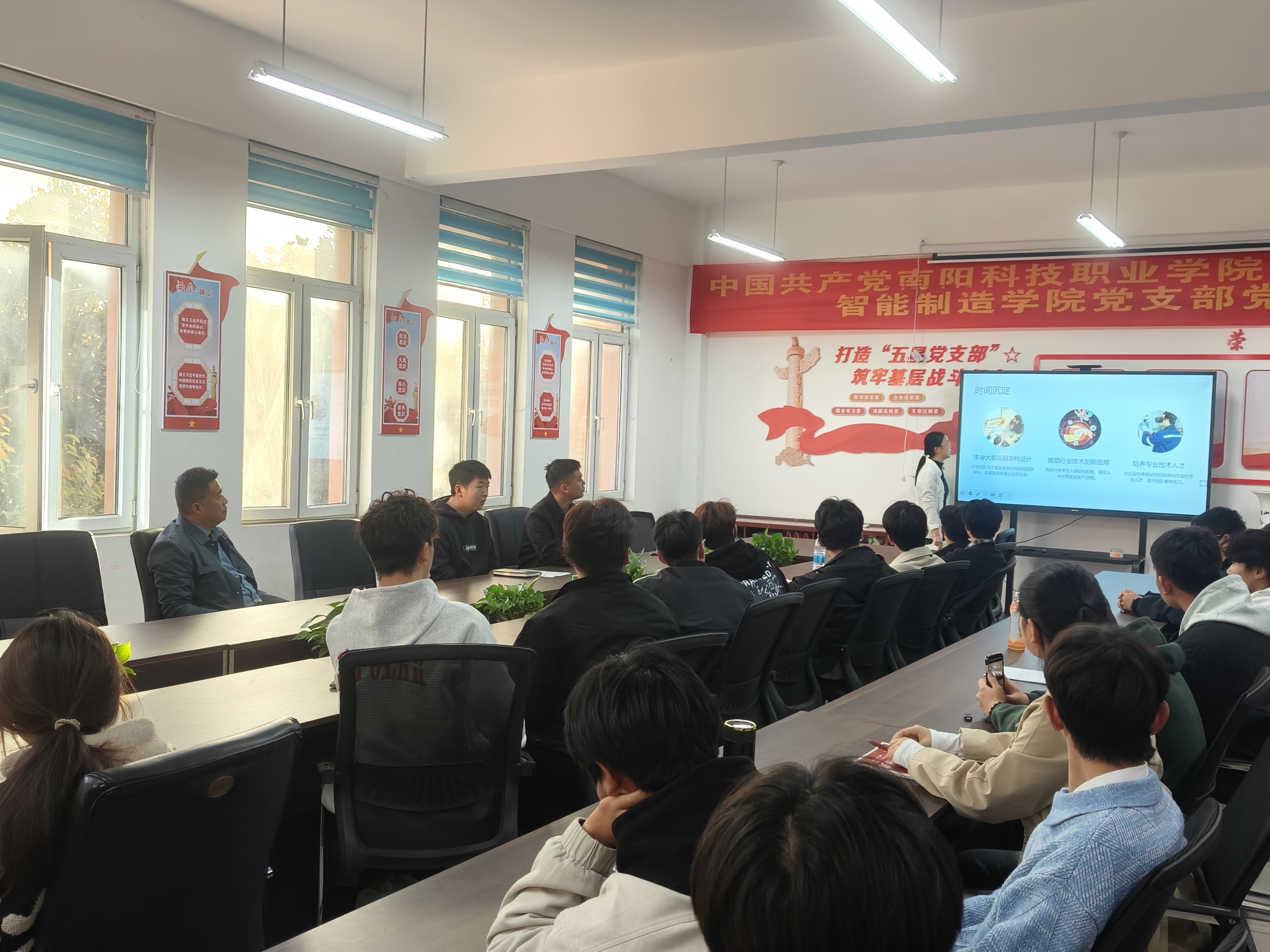 为贯彻党中央、国务院关于做好高校毕业生就业工作的决策部署,落实《河南省教育厅办公室关于举办第三届全国大学生职业规划大赛河南省赛的通知》精神,我院于2025年11月11日-12日在党员活动室举办大学生职业规划大赛院级比赛,本次比赛特邀招生就业处处长张荣伟、智能制造学院党支部副书记赵钦和辅导员闫之卓为参赛学子提供专业指导。