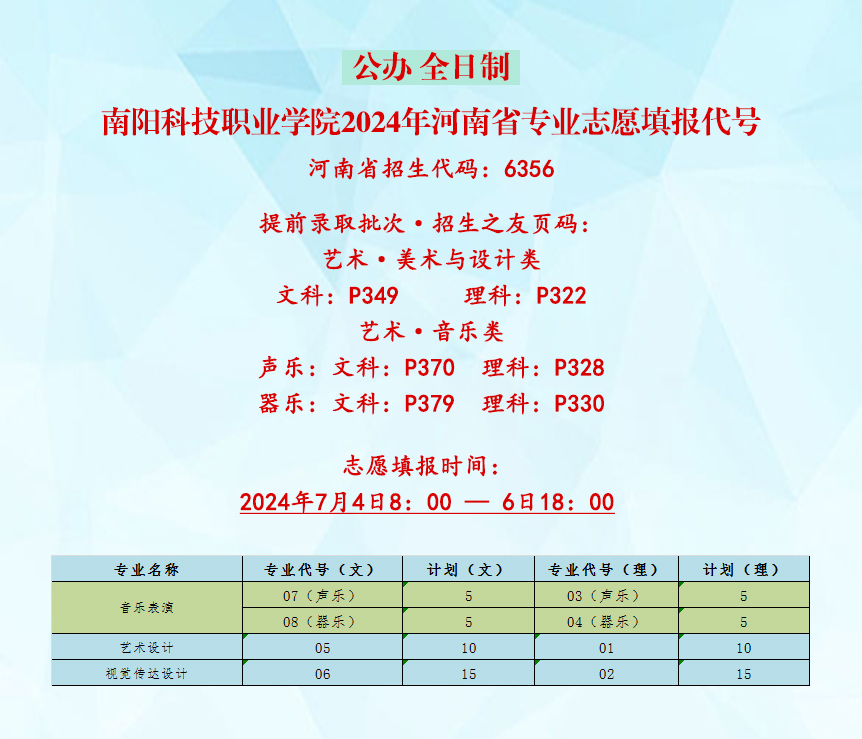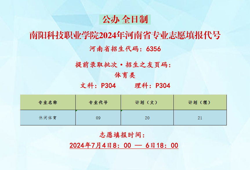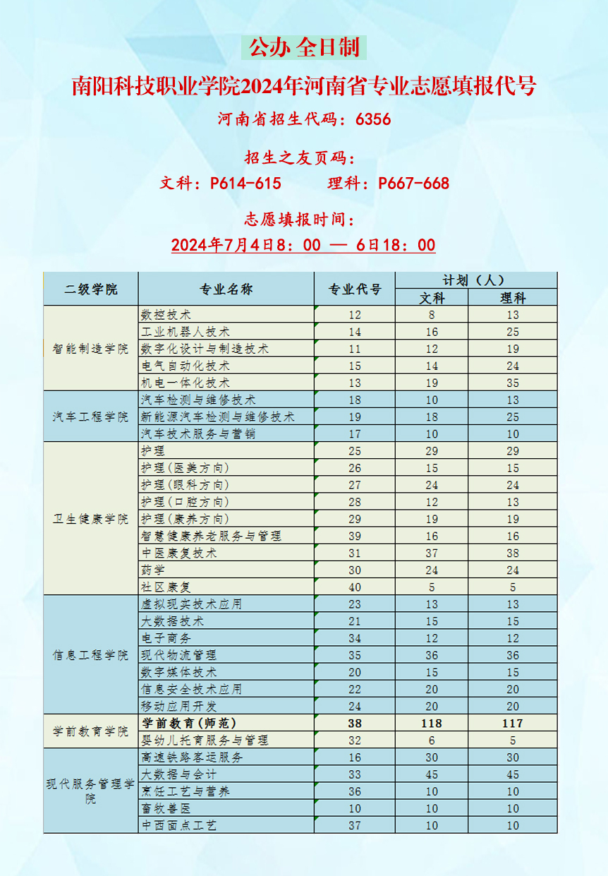 南阳科技职业学院2024年河南省专业志愿填报代号